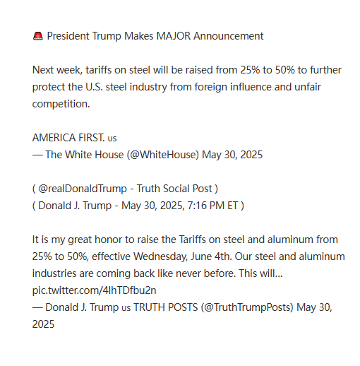 白宫和特朗普在社交平台宣布,下周将把外国进口钢铁关税从25%加到50%: