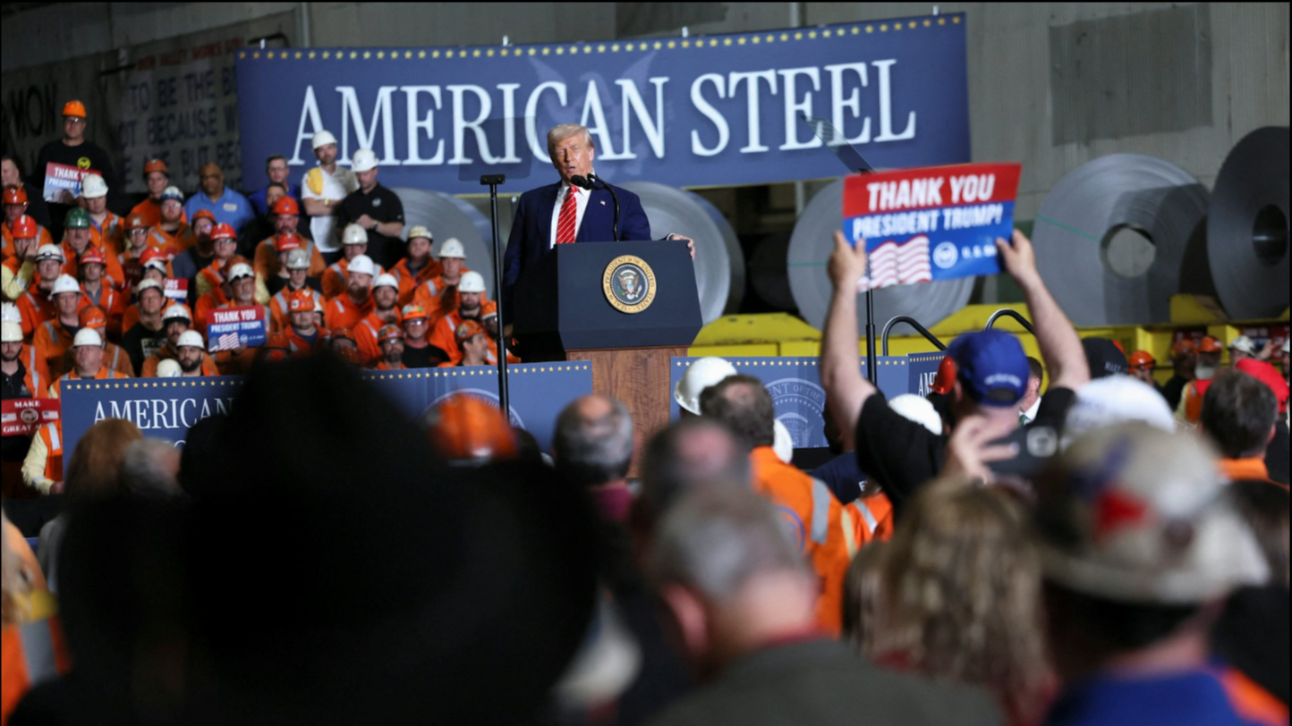 据路透社报道,特朗普在位于宾夕法尼亚州的美国钢铁公司欧文工厂(US Steel Corporation-Irvin Works),向钢铁工人宣布加税的消息。他之后在自家社交平台宣布增加进口钢铁关税将于下周三(6月4日)生效。