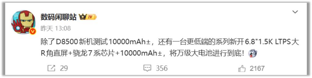 博主数码闲聊站近日暗示:“独家,10000mAh±超级大电池已顺利试模,方案可推进量产,预计安排给迭代线的走量中端机~”