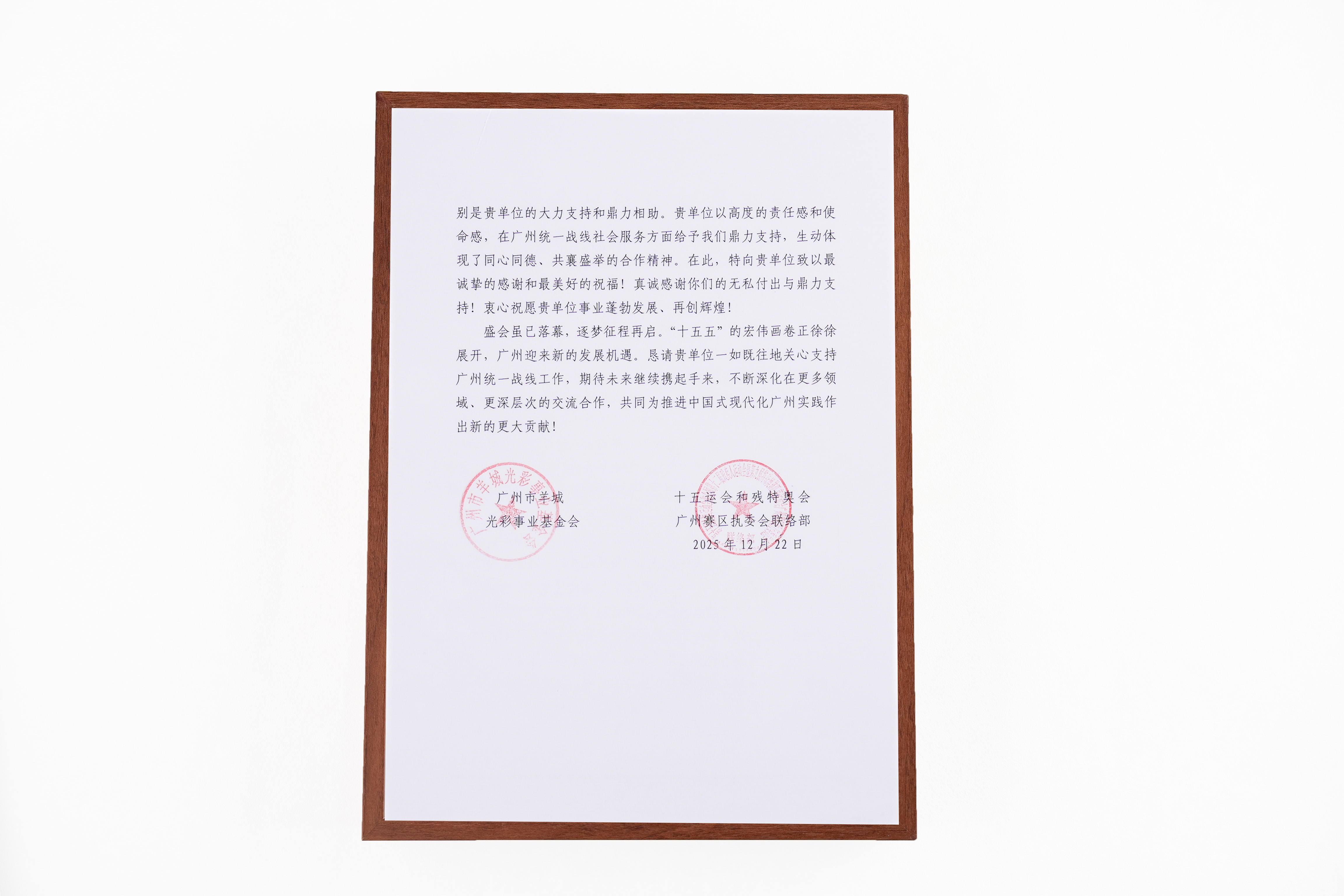 日前,广州市羊城光彩事业基金会联合十五运会和残特奥会广州赛区执委会联络部,向域骉控股发来感谢信,对企业支持全运会筹备及广州统一战线社会服务工作表示诚挚谢意。