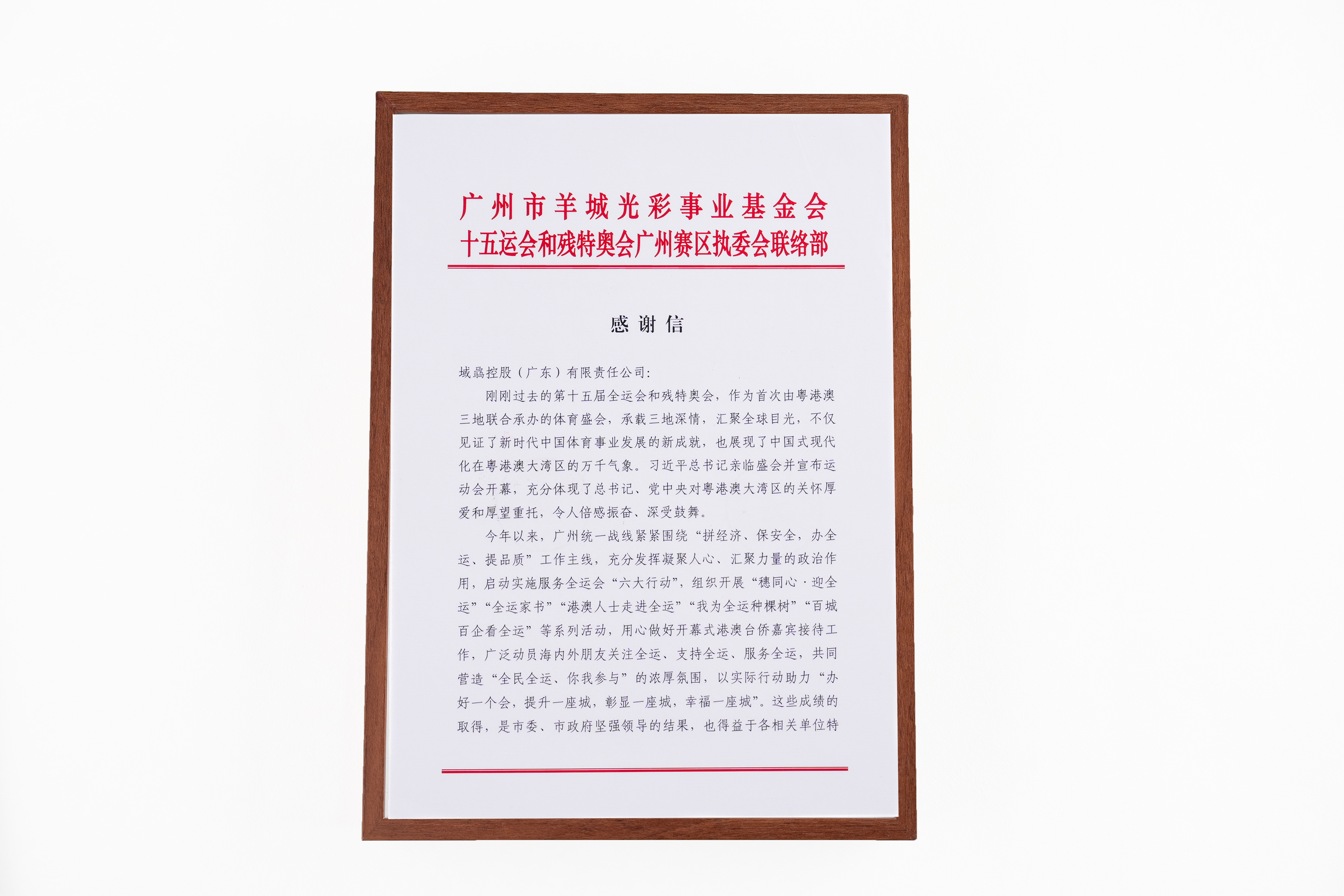 感谢信指出,第十五届全运会和残特奥会是粤港澳首次联合承办的全国性体育盛会,意义重大。广州统一战线紧紧围绕“拼经济、保安全,办全运、提品质”工作主线,实施服务全运会“六大行动”,组织开展“穗同心·迎全运”等系列活动。域骉控股以高度的社会责任感,积极参与其中,为广州赛区筹备工作提供支持,以实际行动助力“办好一个会,提升一座城,彰显一座城,幸福一座城”。