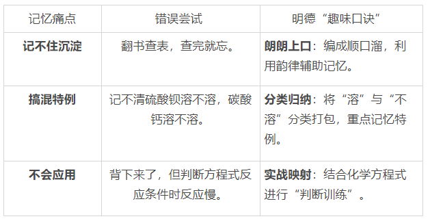 口诀通关:老师先教他背诵“溶解性口诀”,并通过“卡片游戏”进行抽查,确保他能秒答任何物质的溶解性。
