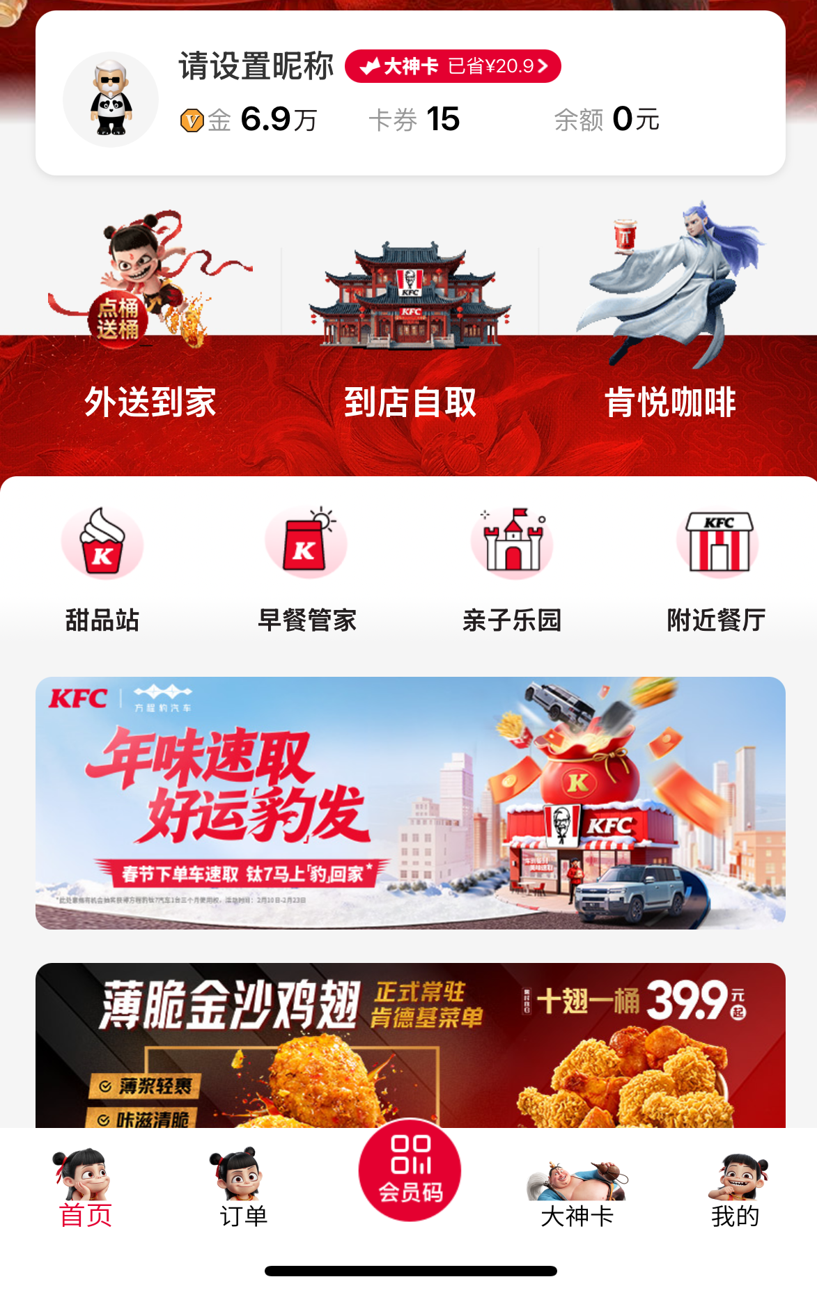 2月10日-23日,打开肯德基APP用"车速取"下单,即有机会赢取方程豹钛7三个月使用权,还有海量品牌周边等你拿。