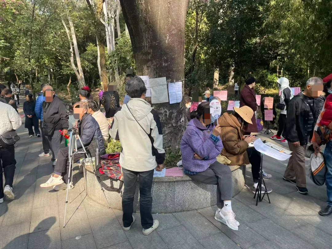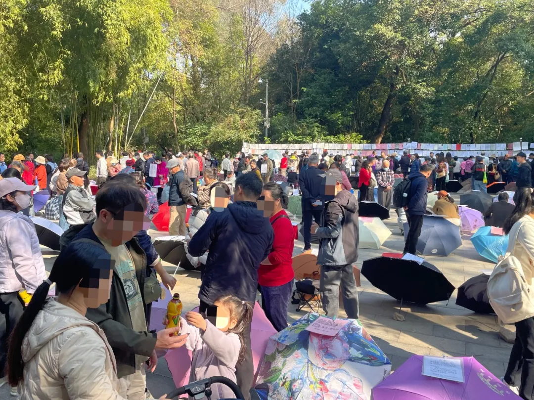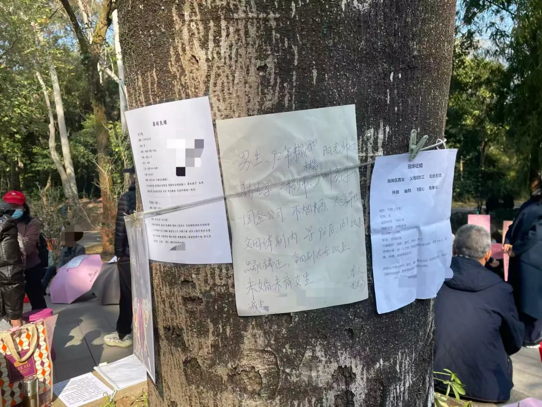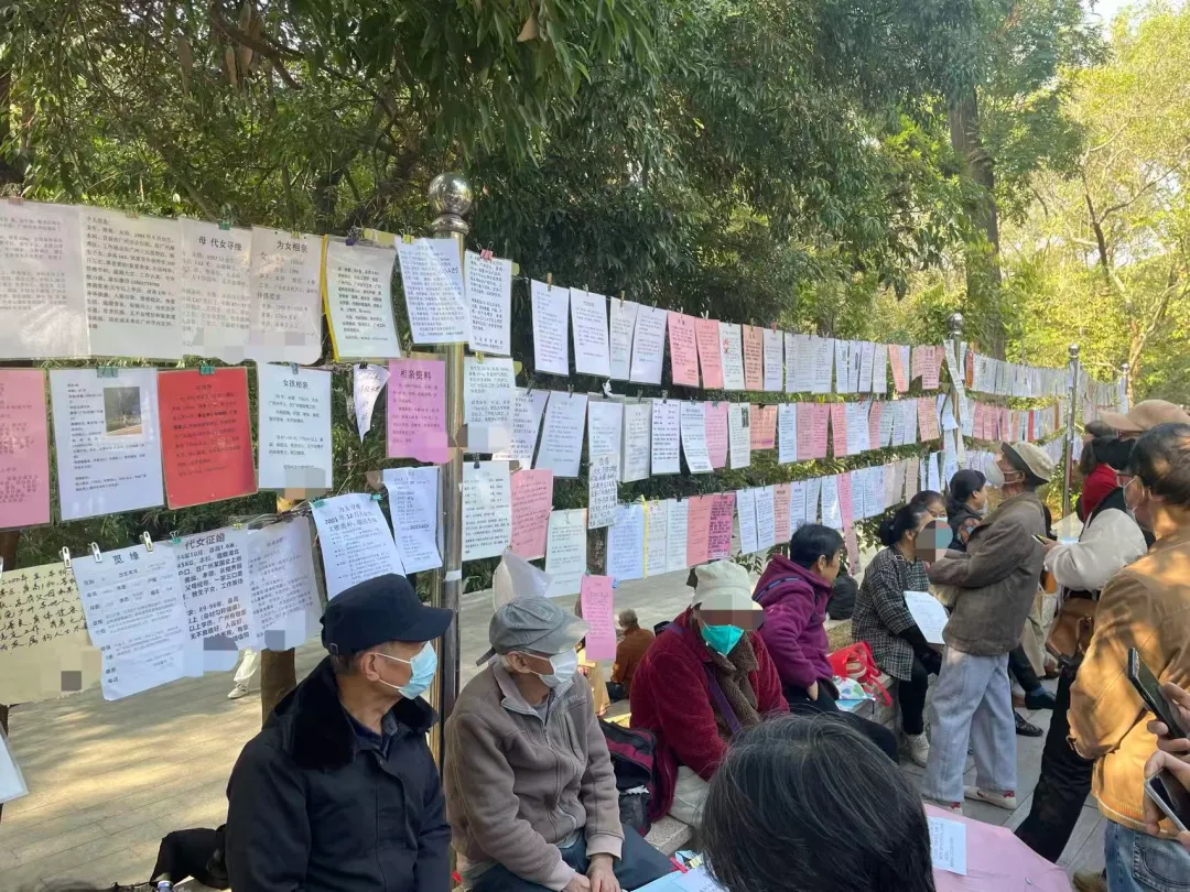 远近闻名的天河公园“相亲角”也开放了,今天下午三点是最多人的时候,场面很热闹。