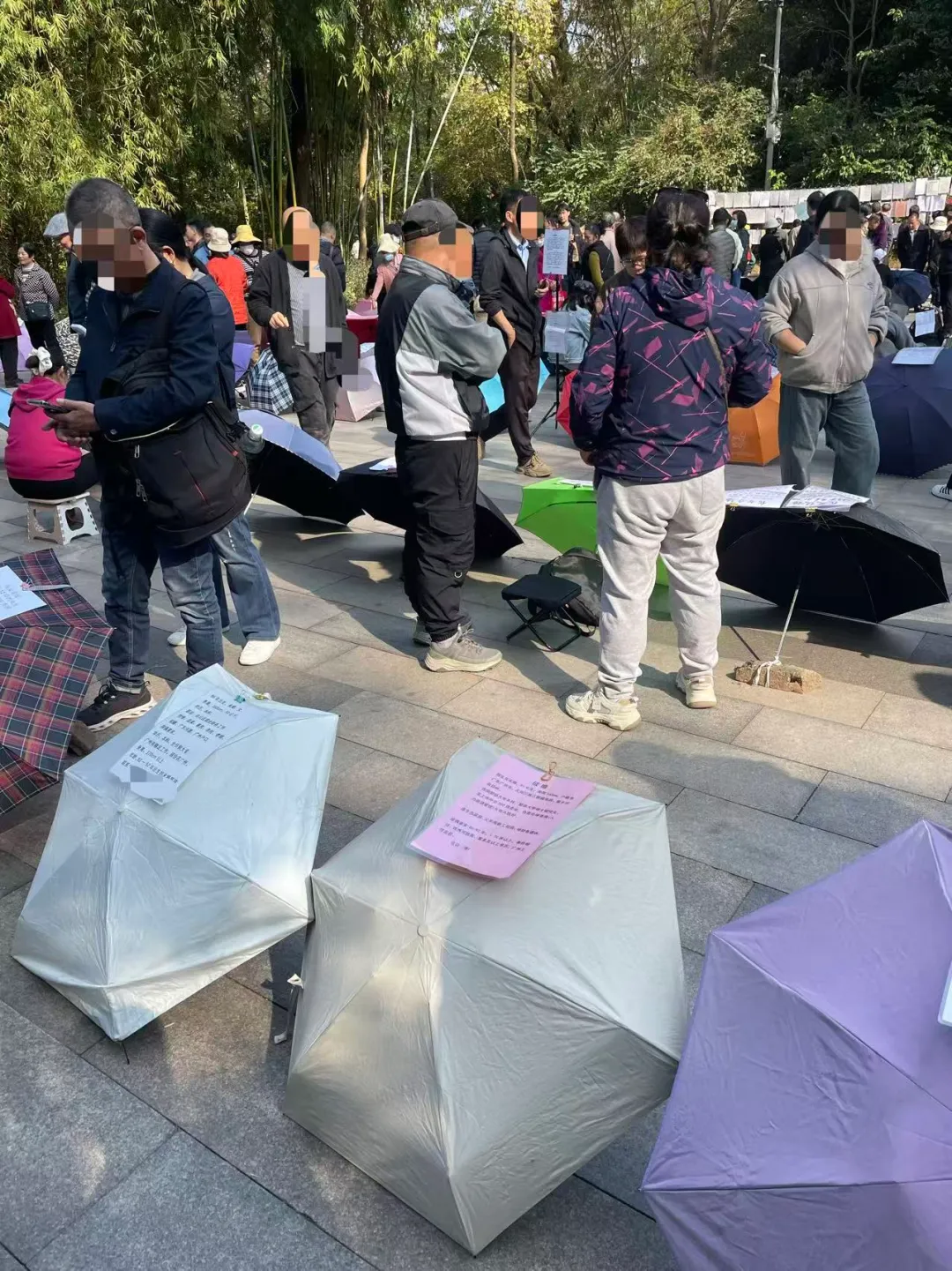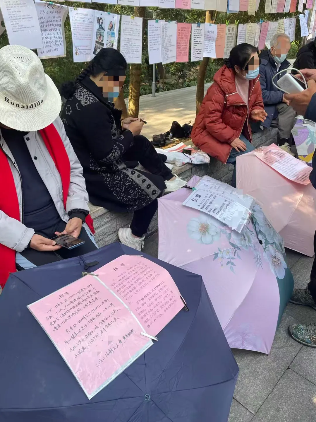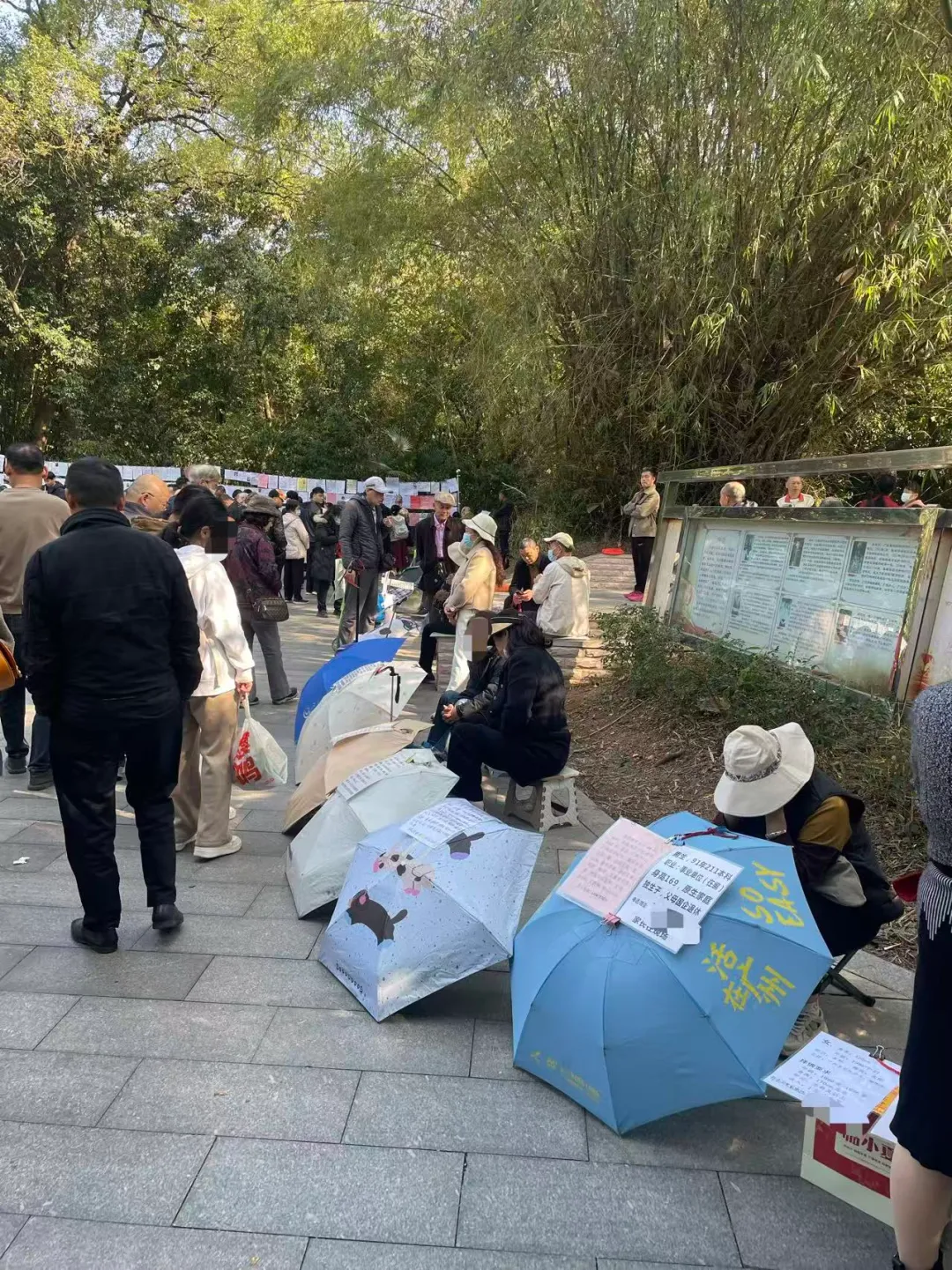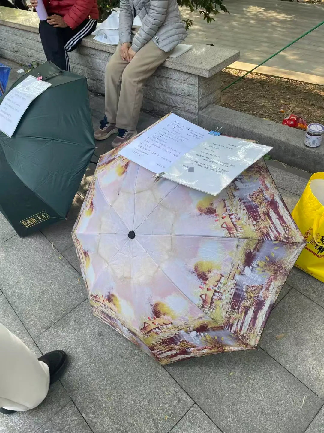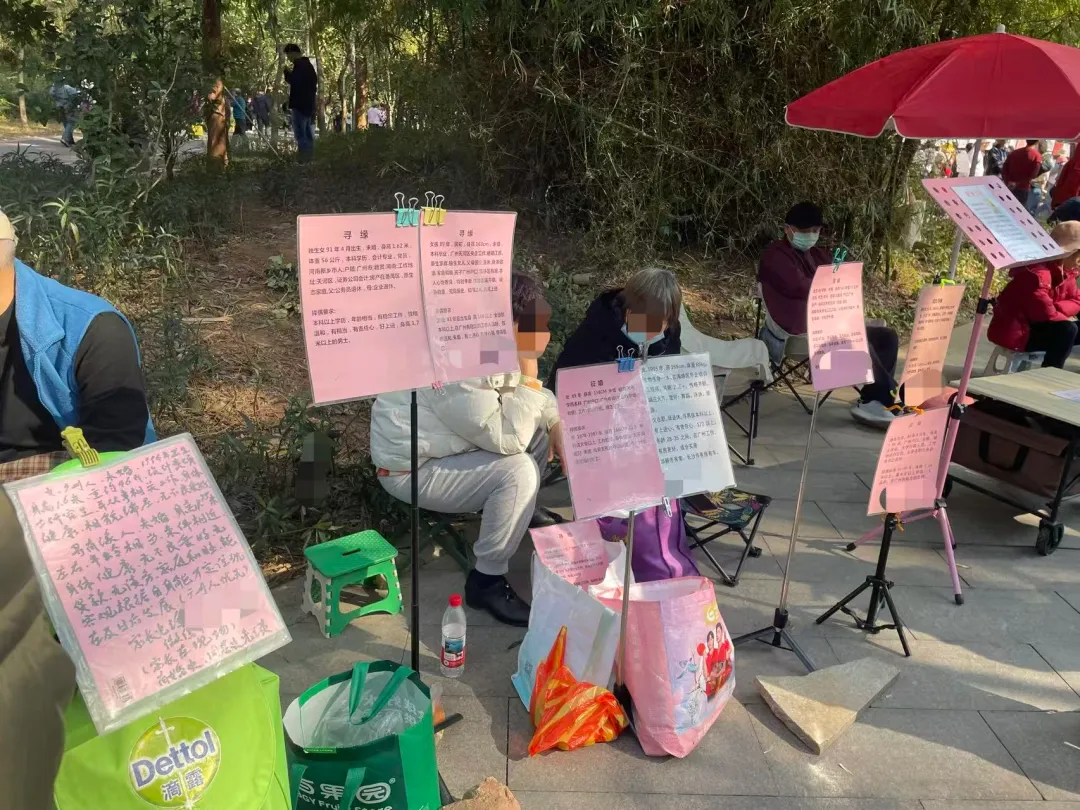 除了雨伞,还有大妈大爷挂到树干上,有的就直接放到台阶上,生怕错过每一个来“挑选”女婿、儿媳的“亲家”。