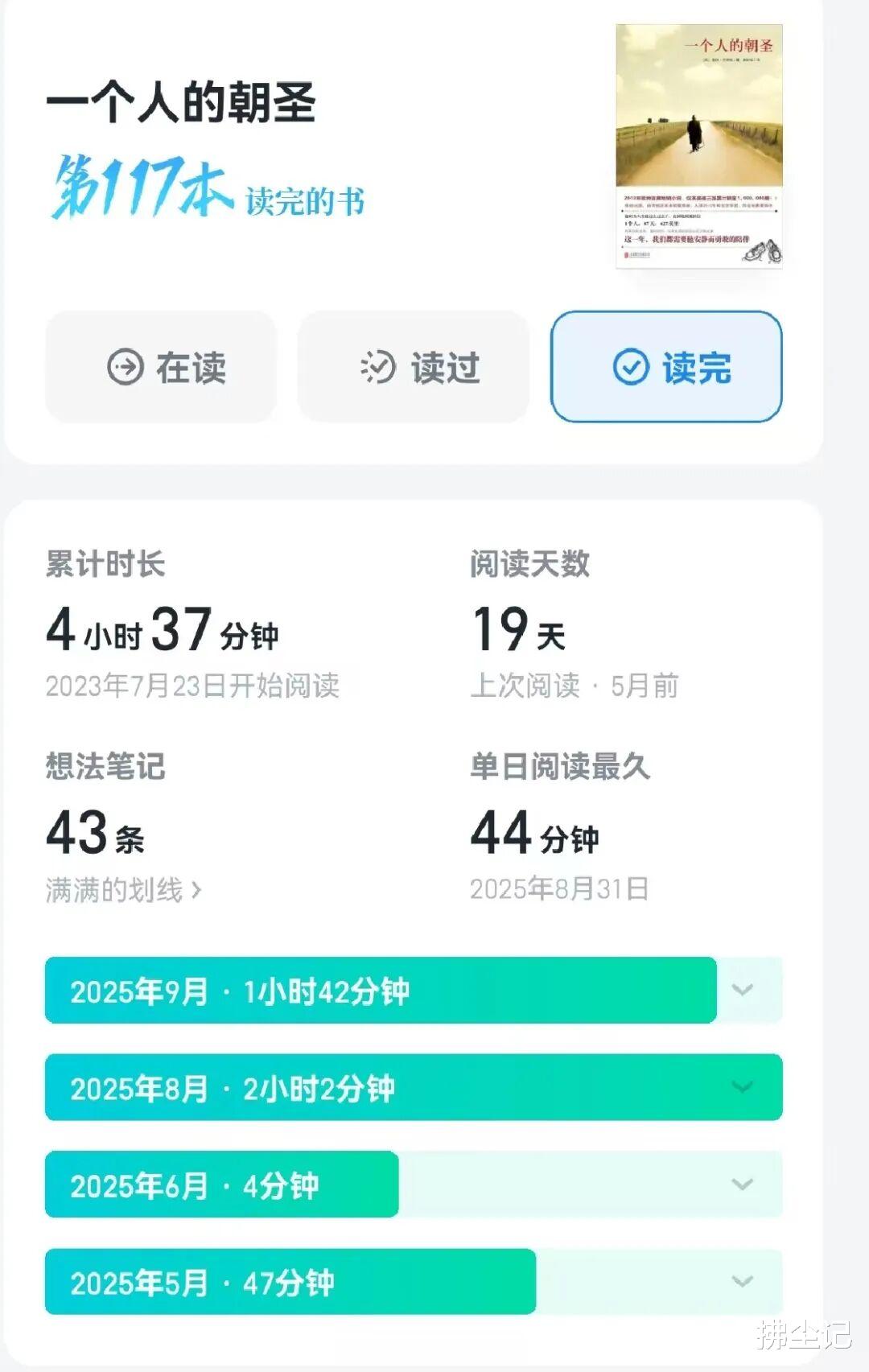去年我看过印象最深的书是《一个人的朝圣》,全书阅读时长只有4小时37分钟,我却断断续续拖了5个月才看完,开头特别枯燥乏味,好几次看不下去,可读完之后却后劲十足,也许这就是经典书的魅力吧。