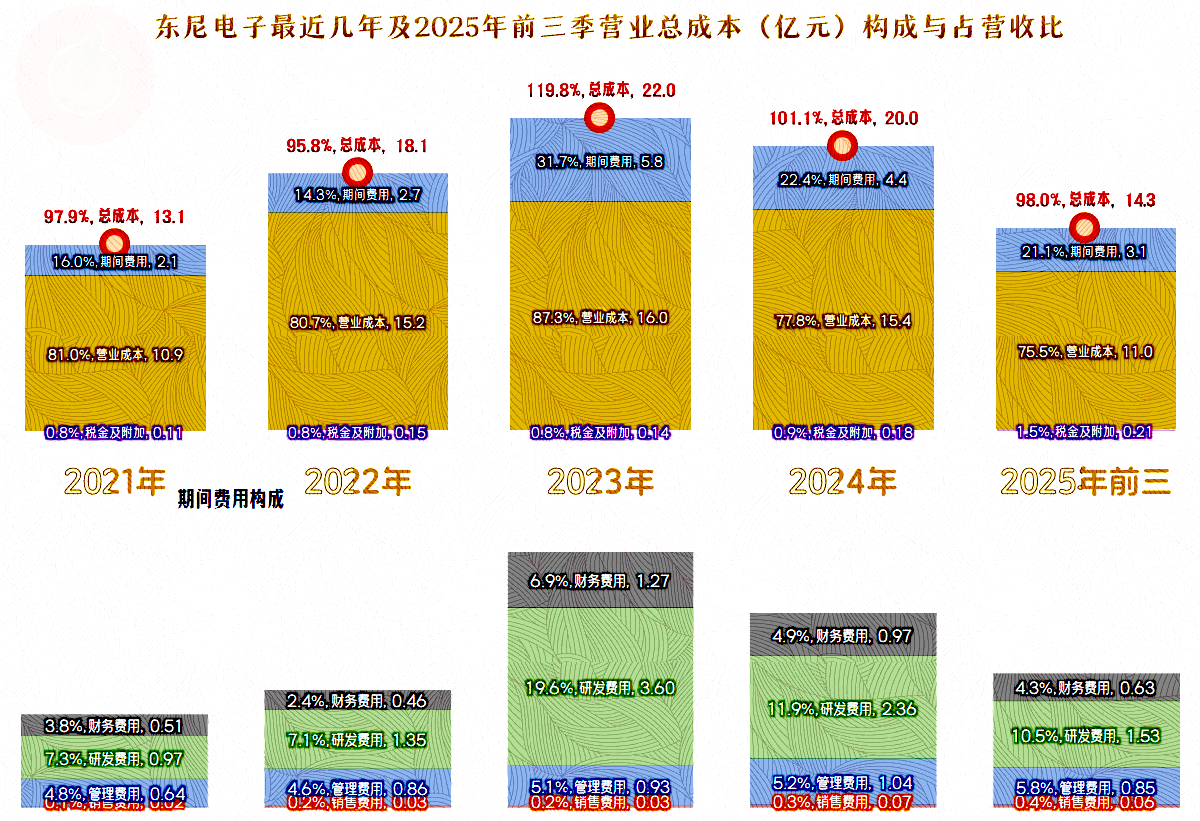 2023年不仅是毛利率暴跌,期间费用也大幅增长,占营收比翻倍式增长,主营业务亏损接近两成;2024年毛利率反弹和期间费用下降,共同把主营业务亏损压缩至1.1个百分点;2025年前三季度,毛利率继续反弹,期间费用占营收比继续小幅下降,主营业务实现了2个百分点的盈利。