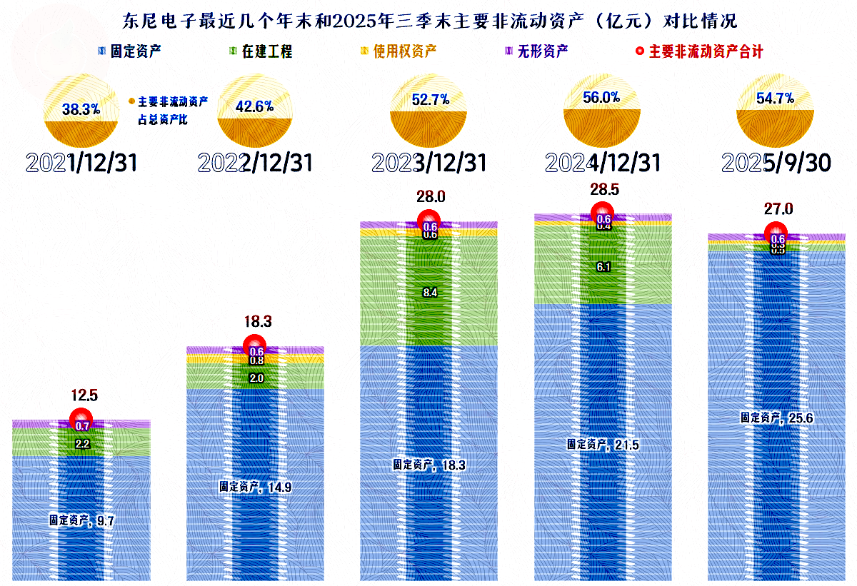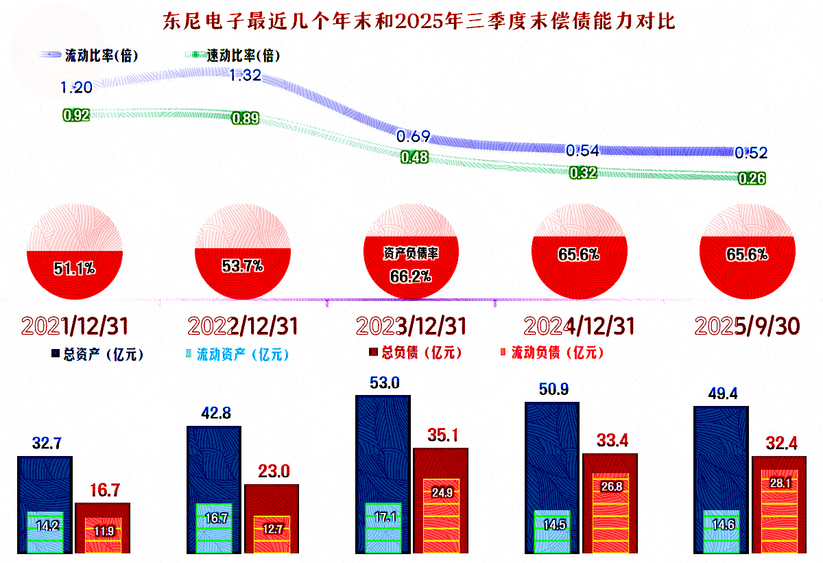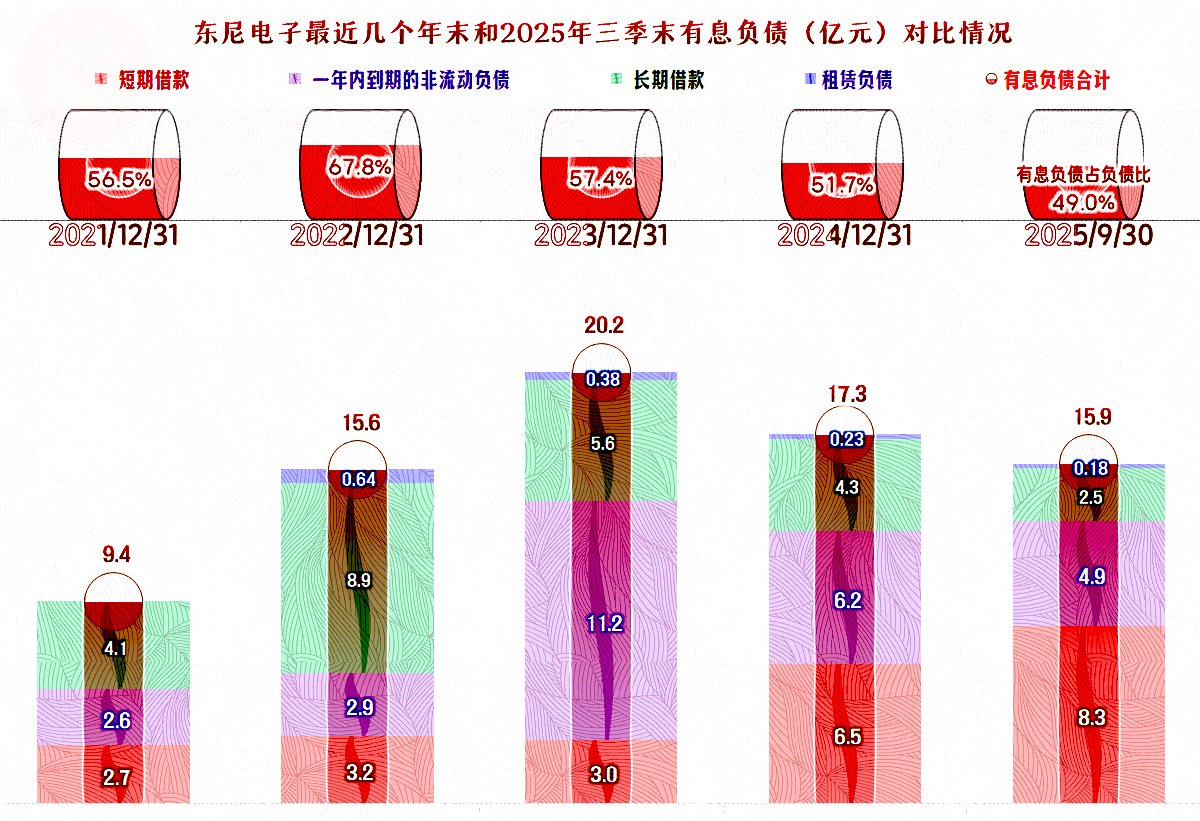 东尼电子的有息负债规模在2023年末超过了20亿元,2024年末和2025年三季度末已经明显下降。我们前面已经看过东尼电子的流动资产结构,就算这些有息负债,偿债压力也不小。如果快速恢复盈利,特别是新投产的项目能带动营收和净利润的大额增长,那当然是好事;如果不能,问题可能还不小。