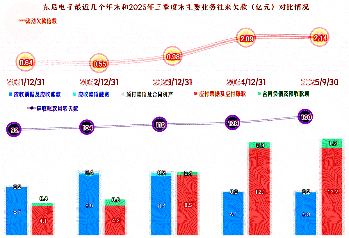 2022年末及以前,东尼电子在供应链方面占用资金并不严重,只占其应收项目的一半左右;2023年末应收和应付基本持平,2024年末和2025年三季度末,应付项目是应收账款的2倍以上。合同负债的增长当然是好事,这预示着未来的营收增长动力不错。但“应付票据及应付账款”的大幅增长,特别是在现在的经济环境下,显然会引起供应商们的不满。