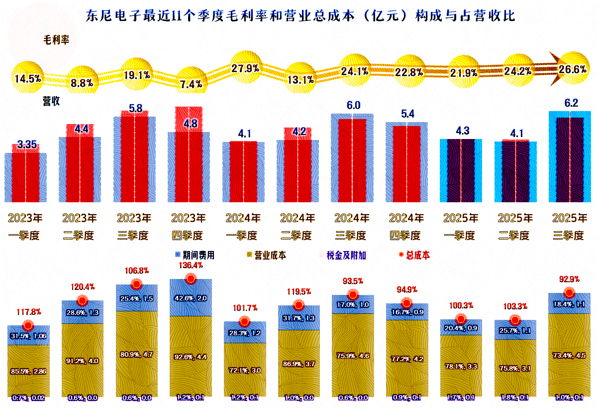 在2024年二季度及以前,毛利率的季度间波动很大,这期间的主营业务全部是亏损状态。之后的毛利率相对稳定,在波动中有增长的趋势,虽然也在2025年前两个季度出现主营业务亏损,但亏损幅度已经没有2024年二季度及以前那么夸张了;特别是2025年三季度,主营业务盈利空间高达7.1个百分点,经营形势确实明显改善。