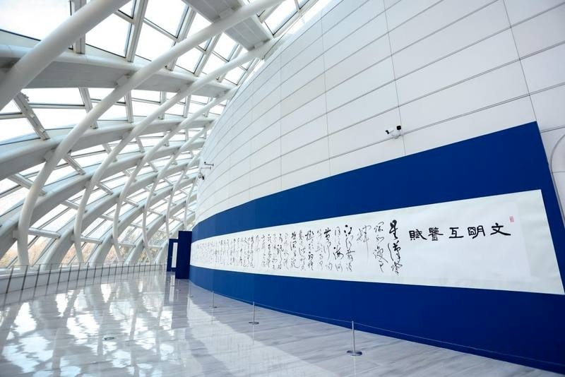 特别值得关注的是,言先生始终坚持以"篆籀笔法"作为贯穿各体的"祖线",这使得不同书体之间既有鲜明的个性特征,又有内在统一的笔墨基因。每一副楹联的内容均为先生自撰,文辞精炼而意境深远,将传统文化的精髓与现代人文思考完美融合,真正做到了"文墨相生,诗书合一"。二十米大草长卷:天地对话写胸怀展览的核心巨制——二十米大草长卷《文明互鉴赋》,堪称当代书法艺术的里程碑之作。这件作品的创作背景具有特殊的时代意义:2025年,由中国倡议、联合国大会通过决议,将每年6月10日设立为"文明对话国际日"。言恭达先生敏锐地把握这一历史契机,以艺术家特有的敏感与担当,创作了这篇呼应时代主题的鸿篇巨制。
