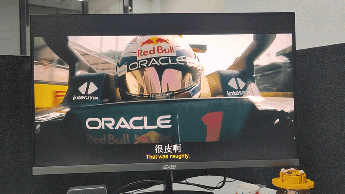 看电影的时候,HDR 功能也很给力!亮部不刺眼,暗部细节也能看得清清楚楚。比如看《F1》的时候,高空的强光和赛道的阴影对比鲜明,皮特脸上的表情、衣服的纹理都看得一清二楚,搭配 27 英寸窄边框大屏,沉浸感十足,摸鱼看电影变成了一种享受。
