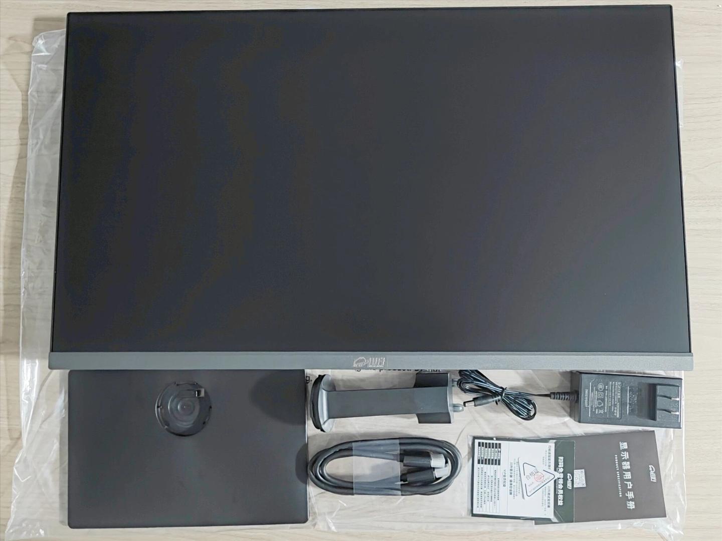 到货直接开箱,先上开箱全家福,配件给得齐全!显示器主体、底座、支架、DP 线、电源线、说明书还有保修卡,不用额外花钱,到手就能安装。
