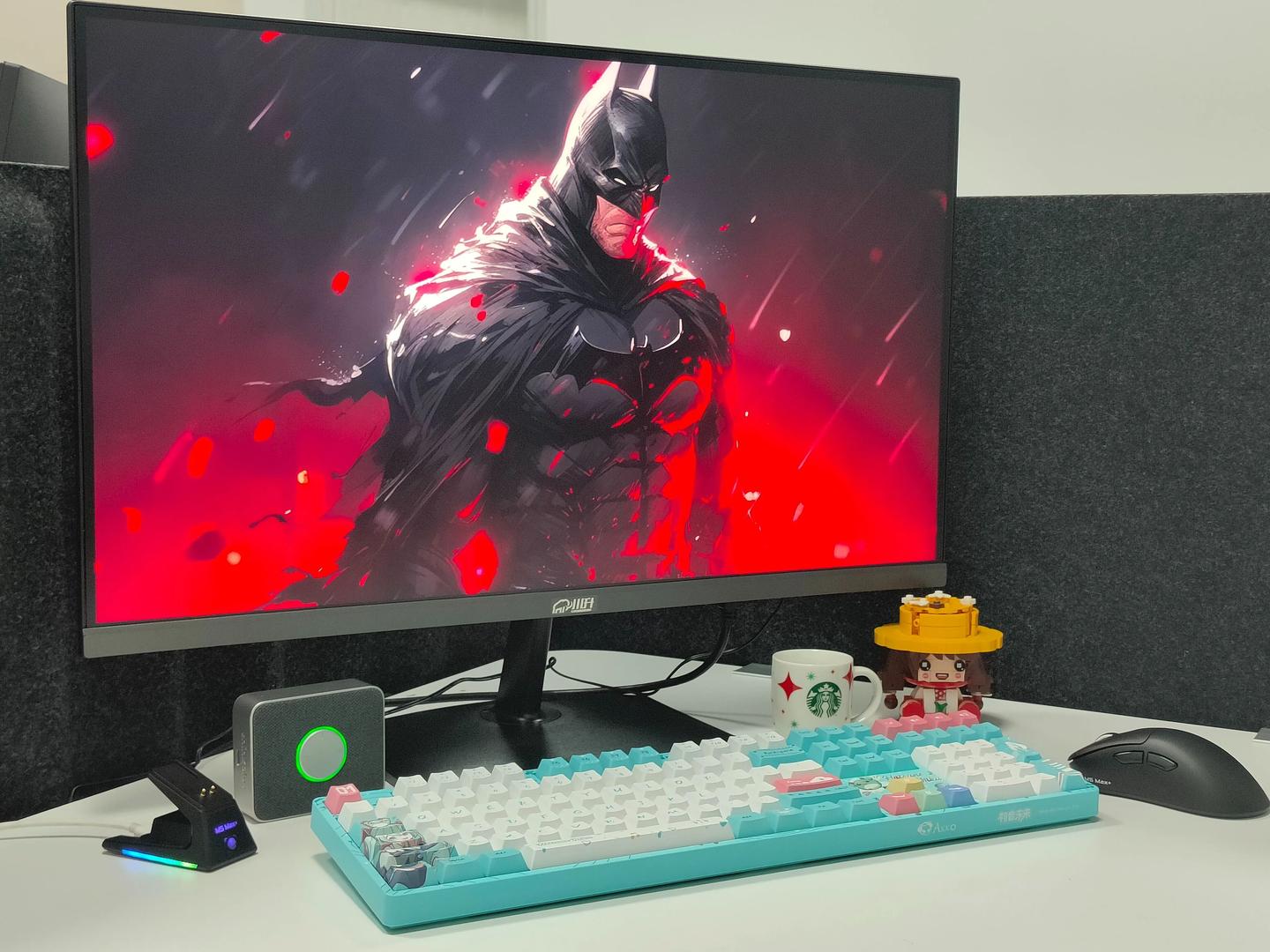 27 英寸的屏幕搭配三面超窄边框,开机之后屏占比十分理想,视觉上特别通透。不管是打游戏还是看电影,注意力完全被画面吸引,根本不会被多余的黑边分心。机身是纯黑色磨砂材质,摸起来很有质感,简约又大气。