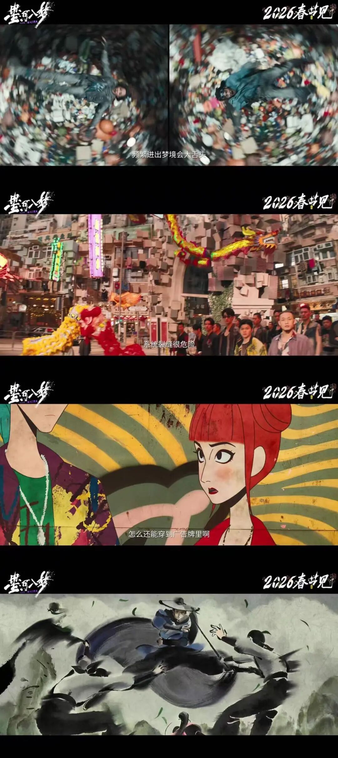 这种可玩性被落实为一种具体的体感。不同于《2001太空漫游》或《流浪地球》以宏大、稳重、固定机位建立的肃穆感,《星河入梦》的镜头语言更像一台随时加速的游乐设施。韩延用快速推拉的镜头运动、节拍明确的动作编排,以及高密度的音画节奏叠加,把眩晕、失重、坠落、被抛出的瞬时感受直接施加到观众身上。比如徐天彪与李思蒙被卷入葛洋梦境、多层折叠空间的段落中,镜头以过载的加速度穿梭楼宇间;紧接着,两人又瞬间化为二维水墨动画角色,叙事视角也切换为平面动画,观众也得以拥有多样的梦境体验。