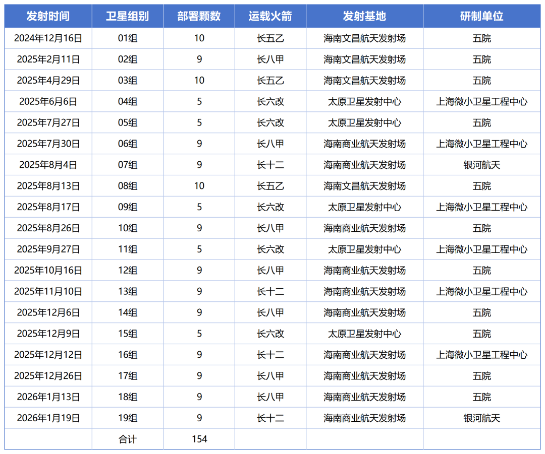 截至2026年1月19日,GW星座已经部署154颗卫星,从组网里程碑来看,2029年前需完成约1300颗的部署目标,意味着后续需要持续的规模化部署能力。
