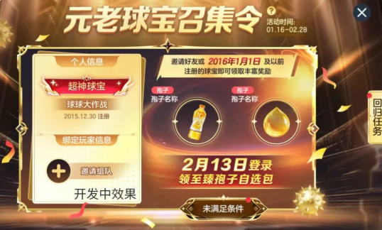 2016年1月1日前注册的老玩家,若本次成功被召回回归,将获得尊贵称号 「波拉哩传奇球宝」。