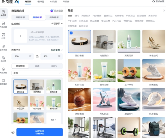 在场景选择上,易可图内置了大量预设场景模板,覆盖多种电商风格。如果预设场景不符合需求,也可以通过自定义场景方式,输入文字描述或上传参考图来生成新场景,并通过参数设置控制生成效果。