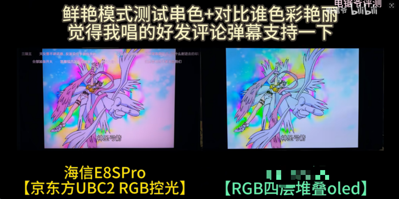 例如在鲜艳模式下播放《数码宝贝》片段,可以看到海信E8S Pro所呈现出的颜色比LG 48G5更加丰富,过渡效果上也要柔和得多,更强烈的视觉冲击会让人很快融入奇幻世界的氛围之中。