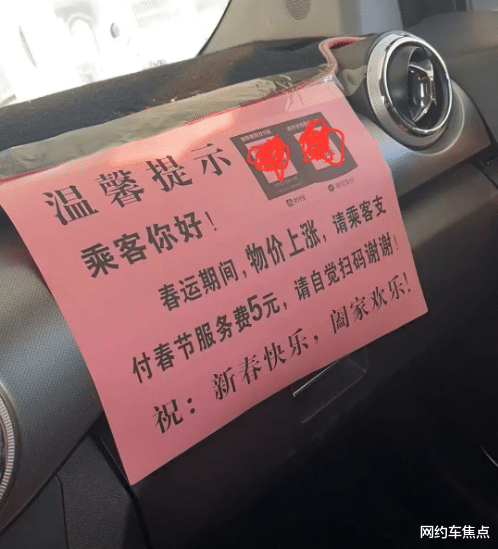 昨天我在一个充电站碰到个老熟人,他正拿着透明胶带往副驾驶后面贴纸条,上面打印着几行字:春运期间,每单加收春节服务费5元,望乘客理解。