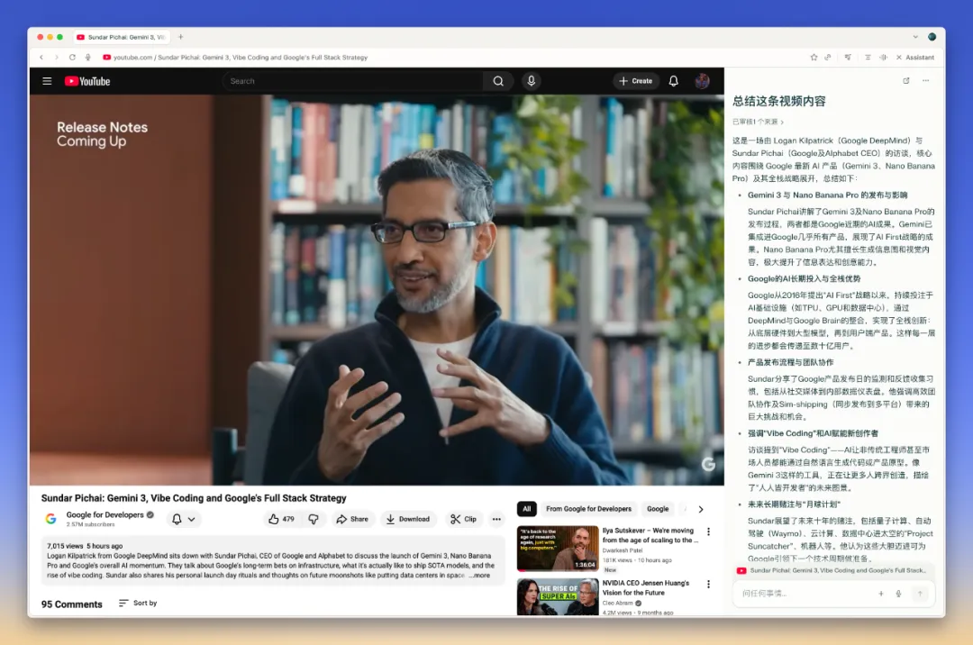 比如打开一条谷歌 DeepMind 团队对皮查伊的访谈视频,就可以让千问对视频内容进行总结和分析。分别与 Atlas 和 Comet 进行对比,千问在响应速度上明显快上不少,对视频内容的总结也更有条理和更具结构化。(Google 虽然也在 Chrome 中加入了 Gemini 助手,但开启条件过于严苛,仅限美国区域及英文语言,故未进行对比测试)