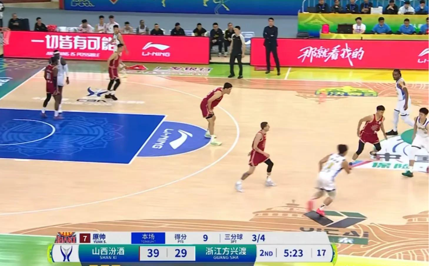 原帅第四记三分打进!卡尔顿强起打成2+1,加罚不中。桑普森两罚不中,奈特抛投又进,塔克强起2分,赵嘉仁三分打进,迪亚洛滞空打进,46-36!塔克突破再进,秦子龙三分涮筐,奈特抢板二次进攻打进,塔克两罚全中。最后一攻,迪亚洛持球突破劈扣打进。单节23-20。半场比赛结束,山西汾酒男篮50-40浙江方兴渡男篮。