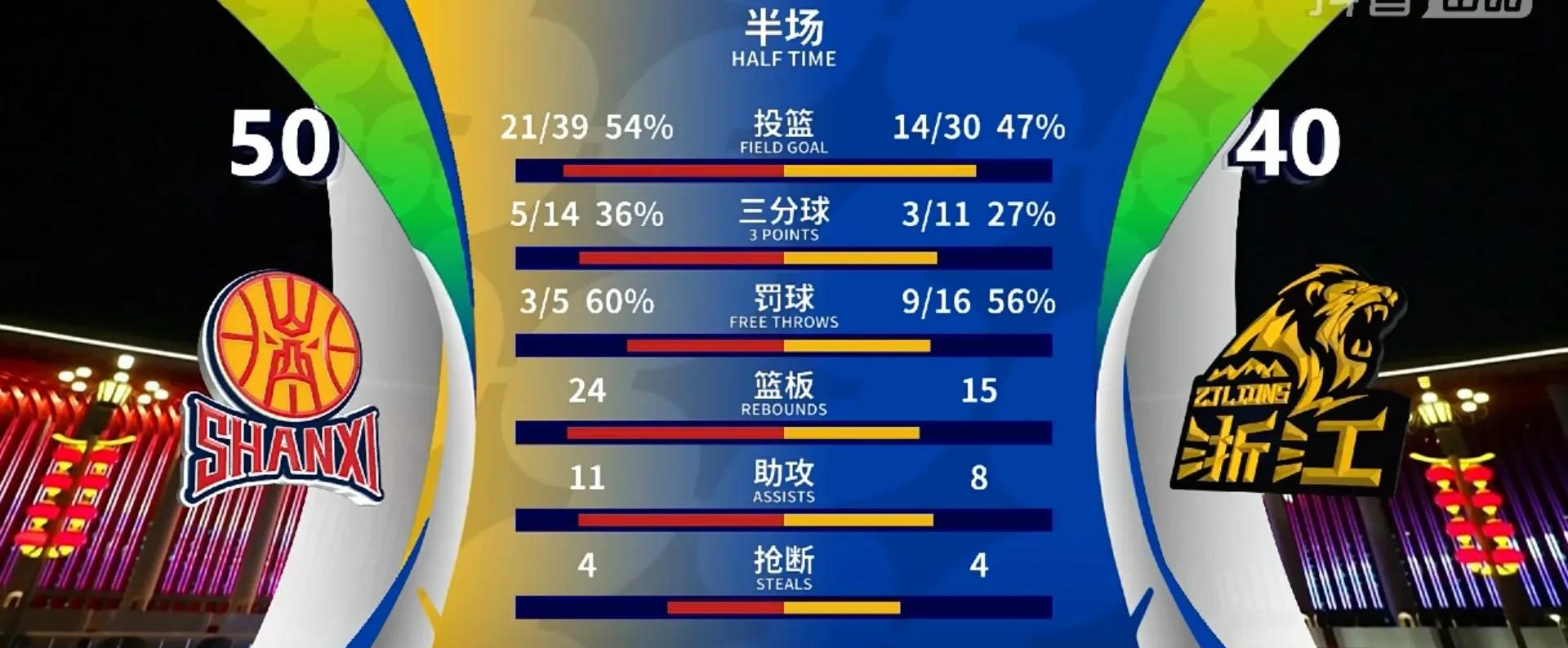 半场比赛,山西汾酒男篮投篮39中21,命中率54%。三分球14中5,命中率36%。罚篮5中3,命中率60%。篮板24个,助攻11次,抢断4次。广厦投篮30中14,命中率47%。三分球11中3,命中率27%。罚篮16中9,命中率56%。篮板15个,助攻8次,抢断4次。