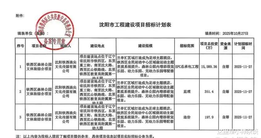 (图片来源于沈阳市公共资源交易网截图)根据其内容显示:项目建设地点位于辽宁省沈阳市铁西区,东至重工街、南至沈大路、西至沈山铁路线、北至铁西区教育局附属第一幼儿园,也就是铁西区森林公园。项目建设规模:兰亭汇区域打造成为足球主题酒店,铁西区全民运动中心区域做运动主题景观系统提升,森林公园内增添萌宠乐园、动力乐园、无动力乐园等配套项目。计划总投资1.5个小目标。(无动力乐园,使用的是无动力游乐设备,是指不需要借助电力,燃油等能源的游乐设备,只需要人力或者自然重力就可以快乐玩耍的设备。)现在这个项目招标了。