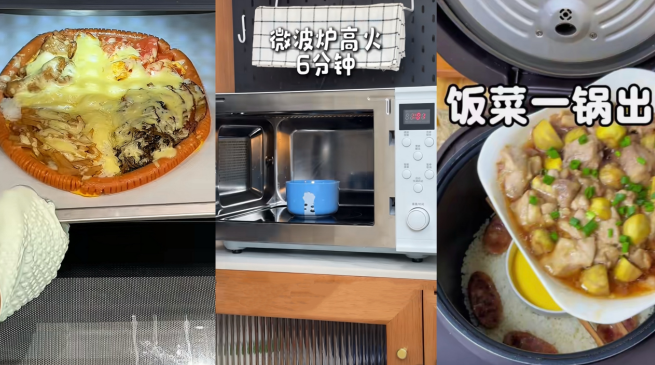 火腿肠围边、意面做底,注入蛋液后铺满馅料芝士,放入蒸烤箱后披萨直接进化成“三室一厅”;砂糖配水放入微波炉炼化,6分钟便能实现冰糖葫芦自由;电饭煲饭菜一锅出……春节将至,“邪修年夜饭”热度在社交平台上持续攀升,#披萨进化出了三室一厅#、#自制微波炉冰糖葫芦#、#邪修年夜饭#、#邪修做饭就是快#等话题视频播放量超10亿次。