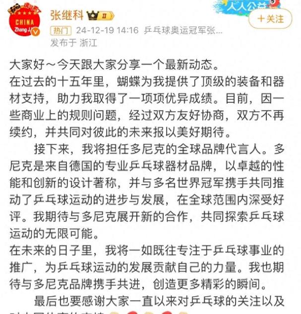昨日,沉寂多时的张继科突然发布新动态,表示自己已和蝴蝶解约,将于多尼克展开新合作。