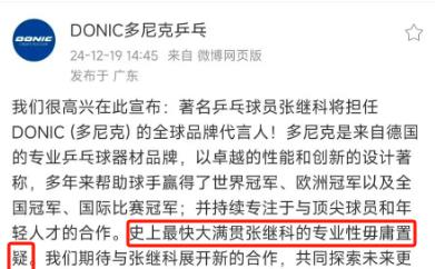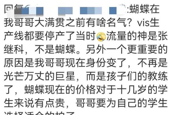 言外之意还有如果不是张继科,蝴蝶哪能来现在的地位,毕竟在张继科代言之前,蝴蝶已经自身难保。