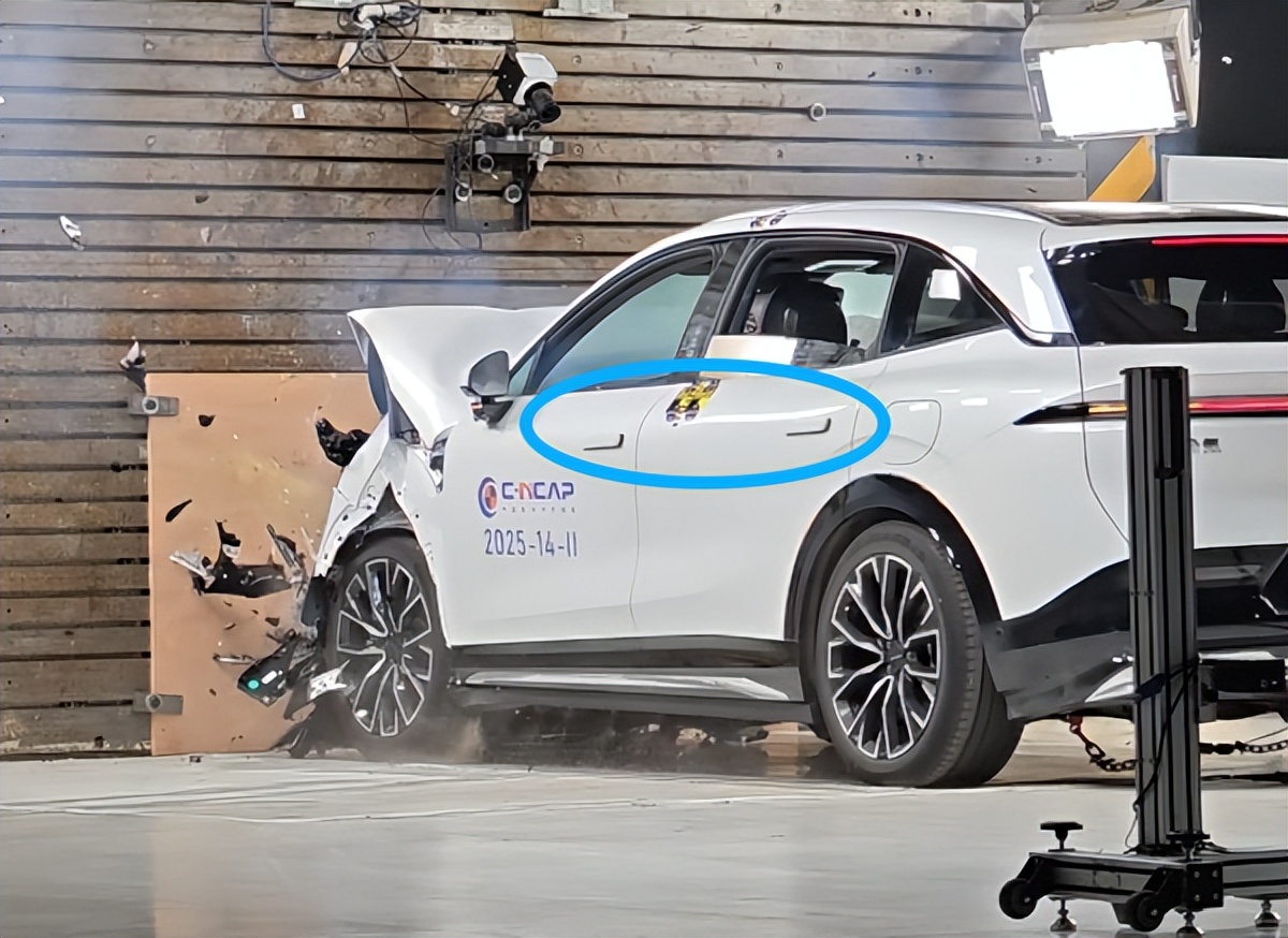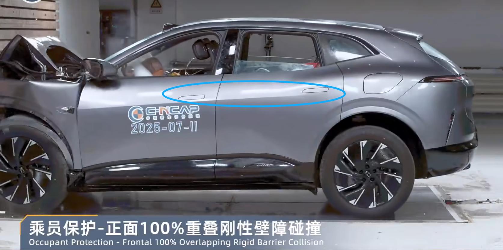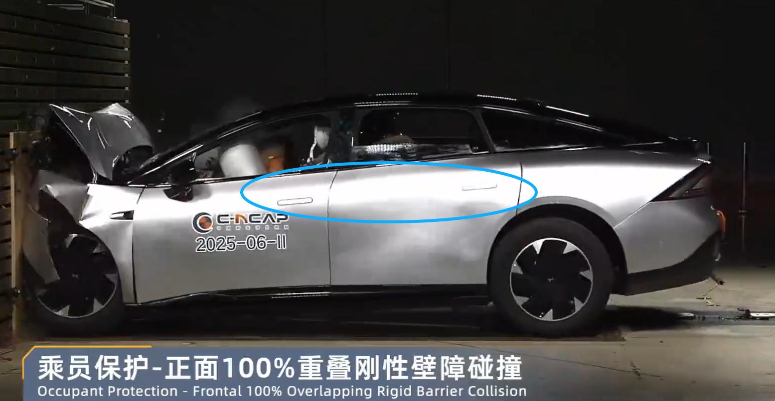我们仔细去翻阅过C-NCAP过往碰撞测试中的历史视频,两种方案都有,本次事故发生的时间是2025年3月,由此推算涉事车型为2024款,从 C-NCAP 实测视频来看,该车型碰撞后隐藏式门把手采用不弹出的设计方案。