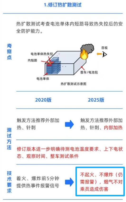 这儿提醒大家重点关注被业内称作是“最严电池安全令”的工信部GB38031-2025《电动汽车用动力蓄电池安全要求》,新标将于2026年7月1号正式实施,将动力电池热扩散要求从“5分钟报警”提升至“不起火、不爆炸”,进一步筑牢产品安全底线。