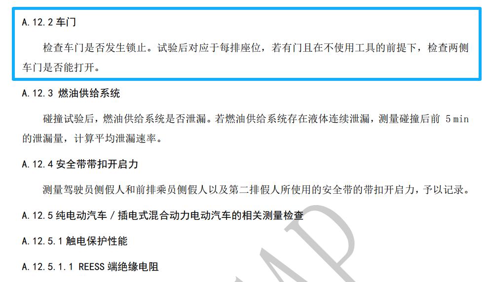 这儿我们可以援引C-NCAP管理规则(2024年版)中的《正面100%重叠刚性壁障碰撞试验规程》中的定义来做个参考,在碰撞测试后对车门的检查要求是:检查车门是否发生锁止。试验后对应于每排座位,若有门且在不使用工具的前提下,检查两侧车门是否能打开。
