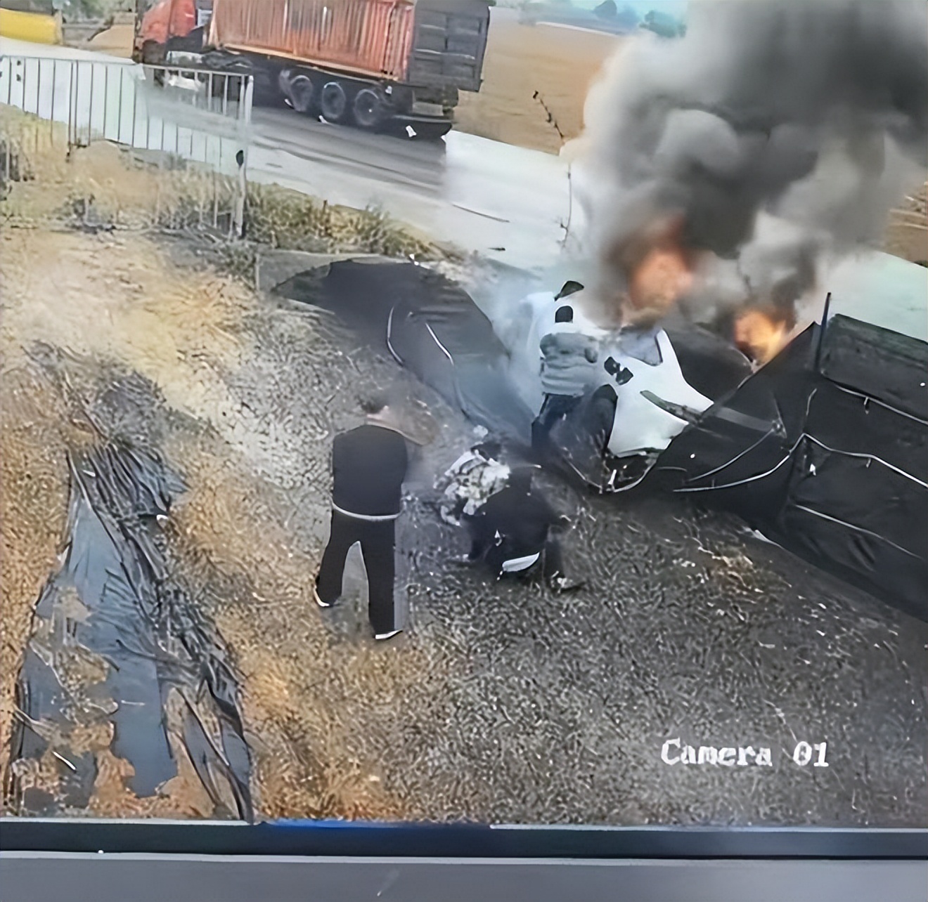 此外,我们推测事故现场的环境也为外部救援带来了阻碍:车辆冲下道路后陷入路边乱石堆,车身周围的空间被石块遮挡,外部人员难以快速靠近车辆并实施破拆、开启等救援操作,而电池起火后产生的有毒烟雾,也进一步增加了救援的难度和风险。