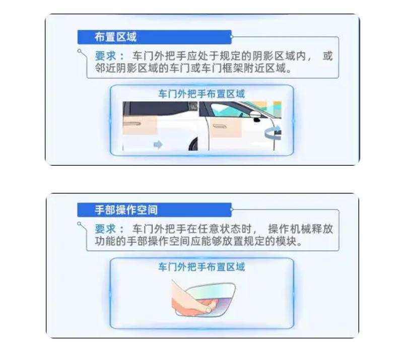 新规的核心要求包括:车门外把手需预留不小于60mm×20mm×25mm的手部操作空间,每个车门必须配备独立的车内外机械释放装置,不依赖车辆电路、电机即可开门,碰撞后救援人员无需专用工具就能开启非碰撞侧车门。这些要求直击全隐藏式门把手的核心安全痛点,解决了“断电打不开、不会操作、救援难”的问题。