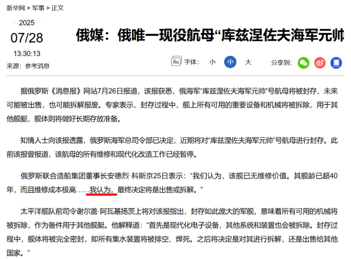 此前,网络上援引退役将军的说法,俄罗斯将不再修复,甚至准备报废拆解,要彻底放弃这艘6万余吨的航母,恐怕是以讹传讹。
