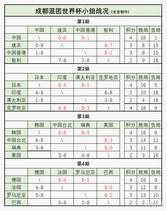 同样能提前出线的队伍还有4支,分别是第二至四号种子日本、韩国、德国,而与日本同组的克罗地亚队也已经过关,不过印度(八号种子)、澳大利亚、智利、美国、巴西均已连输两场,无论第三个比赛日战况如何,它们都已经能确定被淘汰出局,以下为详细积分榜: