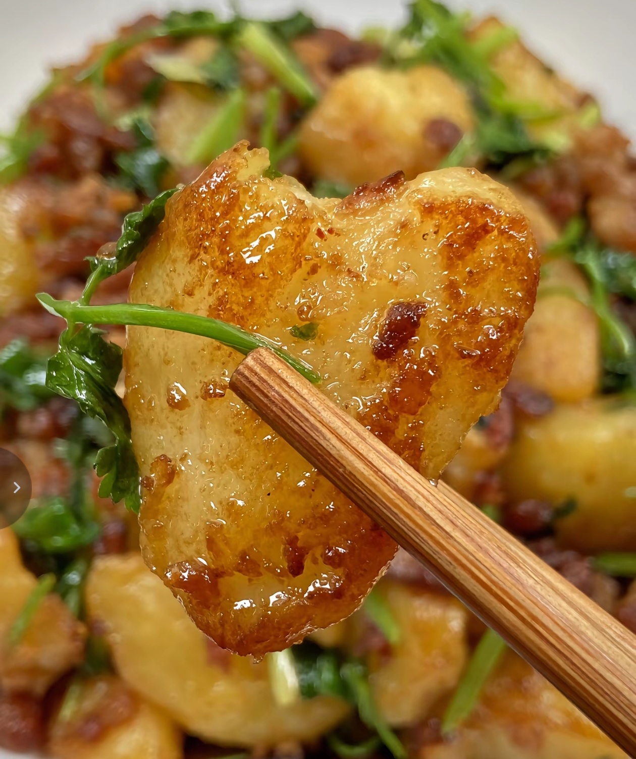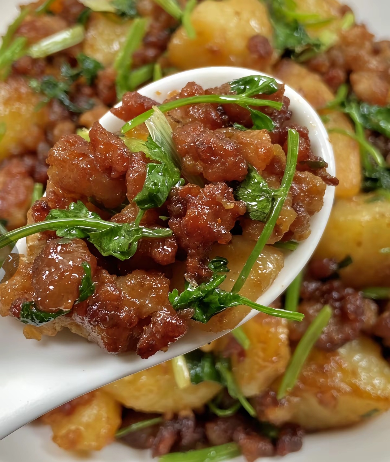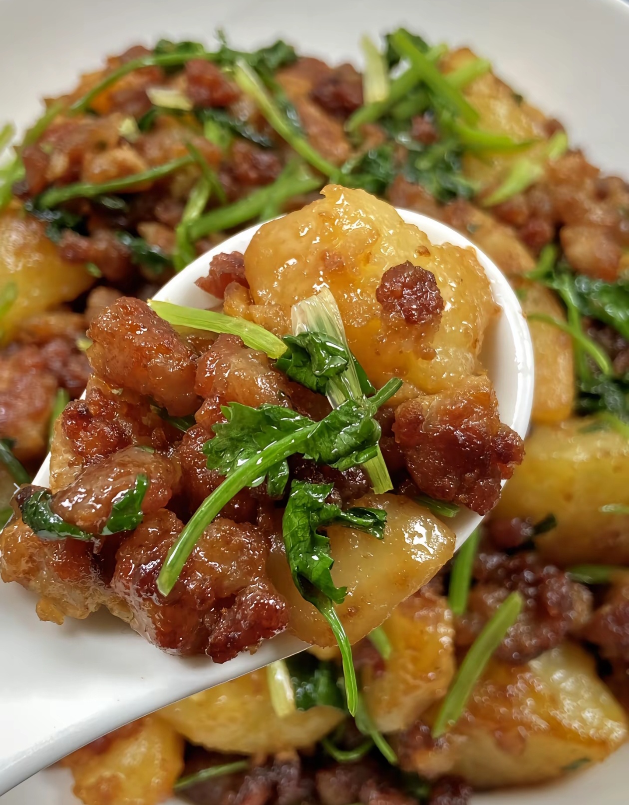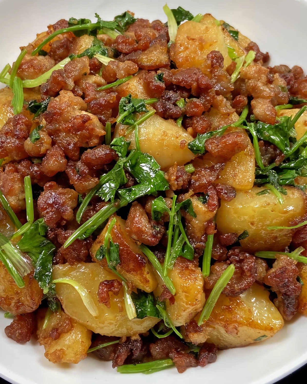 最后一步,就是关火出锅啦,把这道香气扑鼻的香菜土豆肉末盛进盘子里,金黄的土豆、焦香的肉末和翠绿的香菜交织在一起,光是看着就让人食欲大开。这时候的土豆,外皮焦香酥脆,内里软糯入味,每一口都裹满了肉末的咸香和香菜的清新,吃起来又香又下饭,简直是家常菜界的天花板!