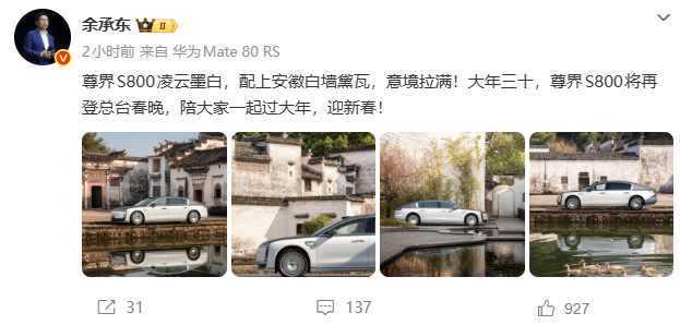 余承东表示,尊界S800凌云墨白配色搭配中式意境美学,将在春晚舞台展现中国高端智能汽车的设计与技术实力。