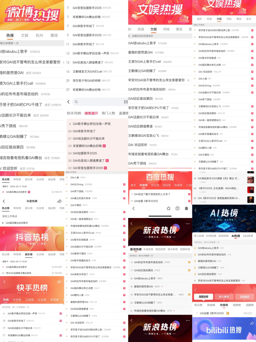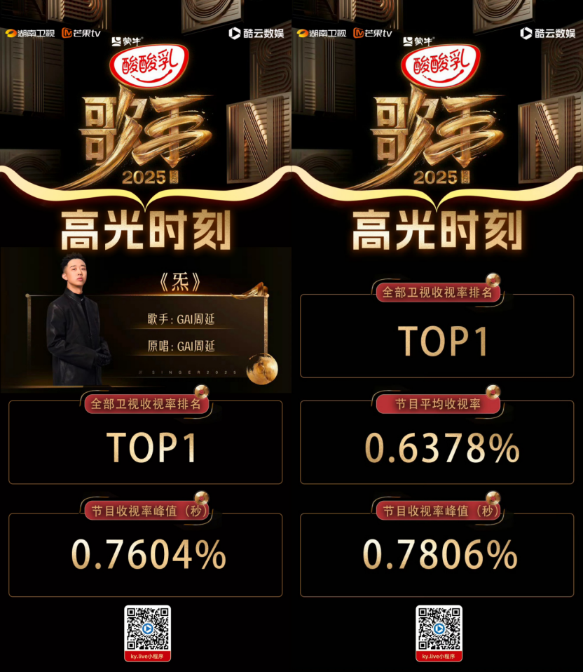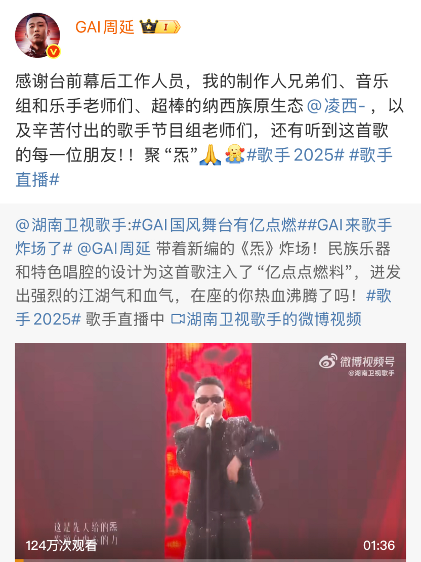 5月16日,湖南卫视《歌手2025》开播,集结华语乐坛中流砥柱、国际音乐巨匠与新生代先锋力量,构建一场跨越时空与文化的音乐对话。作为首发阵容之一的新华流说唱领军人物GAI周延宣布加盟节目,即刻引发乐迷的无限惊喜与期待,他的首场竞演舞台《炁》也不负众望,稳定发挥高燃出圈,演唱时段全国卫视收视率排名TOP1,节目收视率峰值TOP1,以超高热度霸榜微博、抖音、快手、B站、小红书等平台,官宣至首播日共计斩获全网热搜170+个,舞台全网播放量达3700w+,相关话题阅读量破1亿。网友热评“全场最佳,游刃有余!”“最稳的居然是GAI,说唱侠客实力征服全场”“激情澎湃,大气磅礴”“苏黎世歌剧院听了一天歌剧比不过GAI哥这一嗓子让我感到震撼”“因为我们都有民族认同感”……