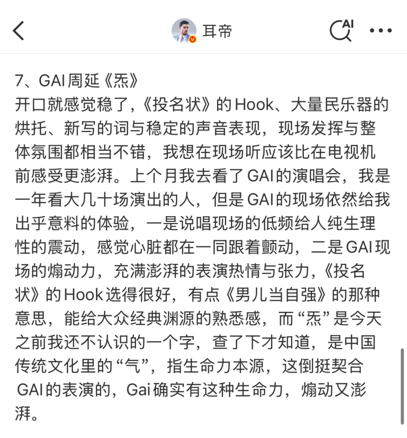 在《歌手2025》的舞台,GAI携歌曲《炁》一登场便气场全开,演唱全程游刃有余,舞台感染力爆棚。微博话题#最稳的竟然是GAI#引发广泛关注与热烈讨论,观众纷纷赞叹“GAI的现场实力,稳得不像话,开口便被折服。”“前有米奇·盖顿的情感轰炸,后有格瑞丝·金斯勒的声压强袭,GAI却筑起了中式说唱的结界。”“在直播无修音的残酷赛制下,GAI竟成了全场最稳的定海神针”。知名乐评人耳帝称赞GAI的舞台《炁》“开口就感觉稳了,《投名状》的Hook、大量民乐器的烘托、新写的词与稳定的声音表现,现场发挥与整体氛围都相当不错,我想在现场听应该比在电视机前感受更澎湃。”