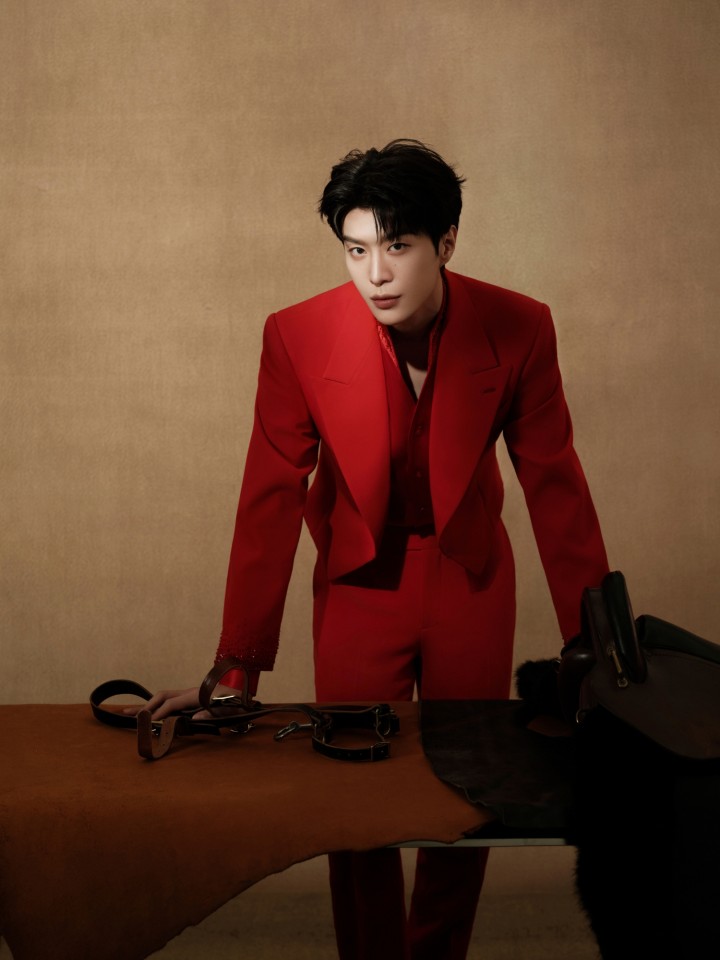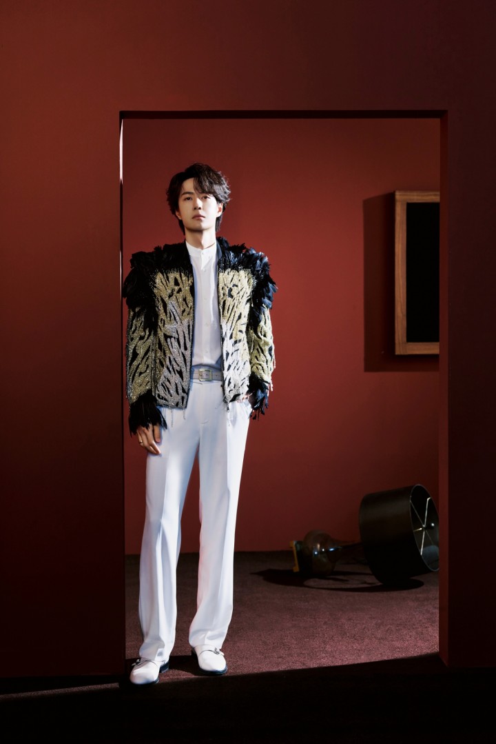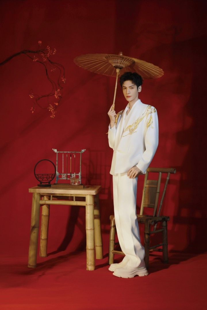 宋威龙红色外套装点苍松刺绣,来自JUNYANG特别定制,俊朗英挺。