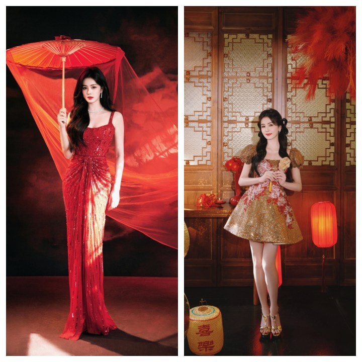 今年的春晚定妆图,跟前几年一样大致是两组,一是还原节目妆造,几位古装姐姐的美得到充分表现。二是春节主题拍摄,这就有了鲜明的特色:女艺人都爱亮片与刺绣。