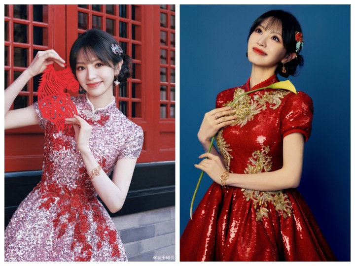 田曦薇身穿金色亮片刺绣红裙,佩戴Qeelin珠宝,别致的发饰,是个清丽明媚的甜妹子呢。