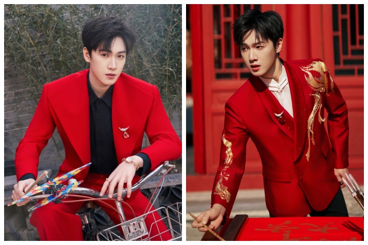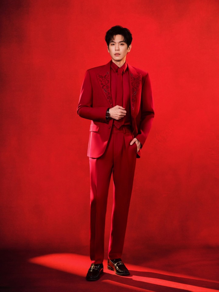 李昀锐春晚首秀,带来红红火火的两套造型,佩戴蒂芙尼“石上鸟”胸针,俊逸翩然。