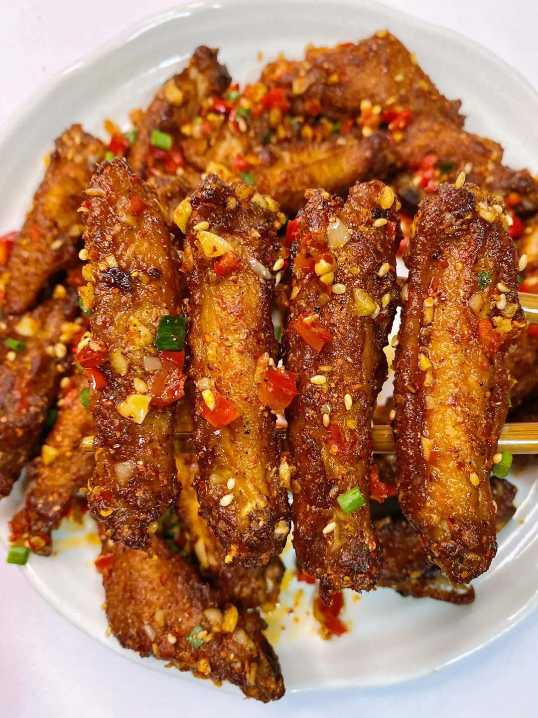 一道外酥里嫩、香气四溢的椒盐鸡翅就做好了。看着这道色香味俱佳的菜肴,是不是已经迫不及待想要品尝了呢?咬一口,外皮酥脆,内里鲜嫩多汁,椒盐和辣椒粉的香气在口中交织,让人回味无穷。