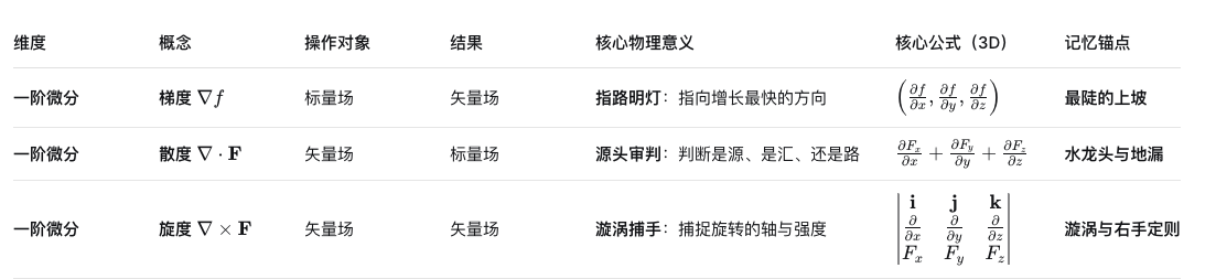 在矢量微积分和物理学中,梯度、散度和旋度是描述场(场的分布)行为的三大核心算子。它们如同三根支柱,共同支撑起我们分析电磁场、流体力学等问题的数学框架。理解它们,不仅在于记住公式,更在于把握其背后的几何与物理图景。