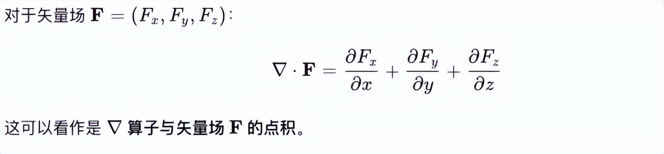 “矢量点乘变成标” —— 两个矢量(∇ 和 F)点乘的结果是一个标量。公式是“自己对自己求导再求和”(Fx 对 x 求导,等等)。