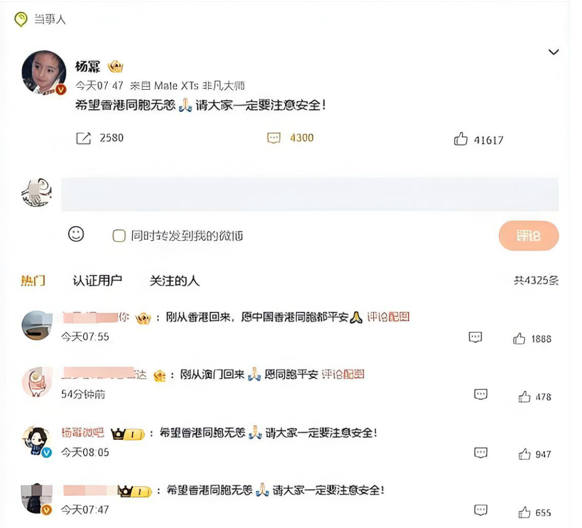 今早(11月27日),内地顶级花旦杨幂第一时间在微博上发声,写下真挚的祈福:“希望香港同胞无恙!请大家一定要注意安全!” 简短的话语瞬间点燃网络,成为一场正能量的暖心接力。